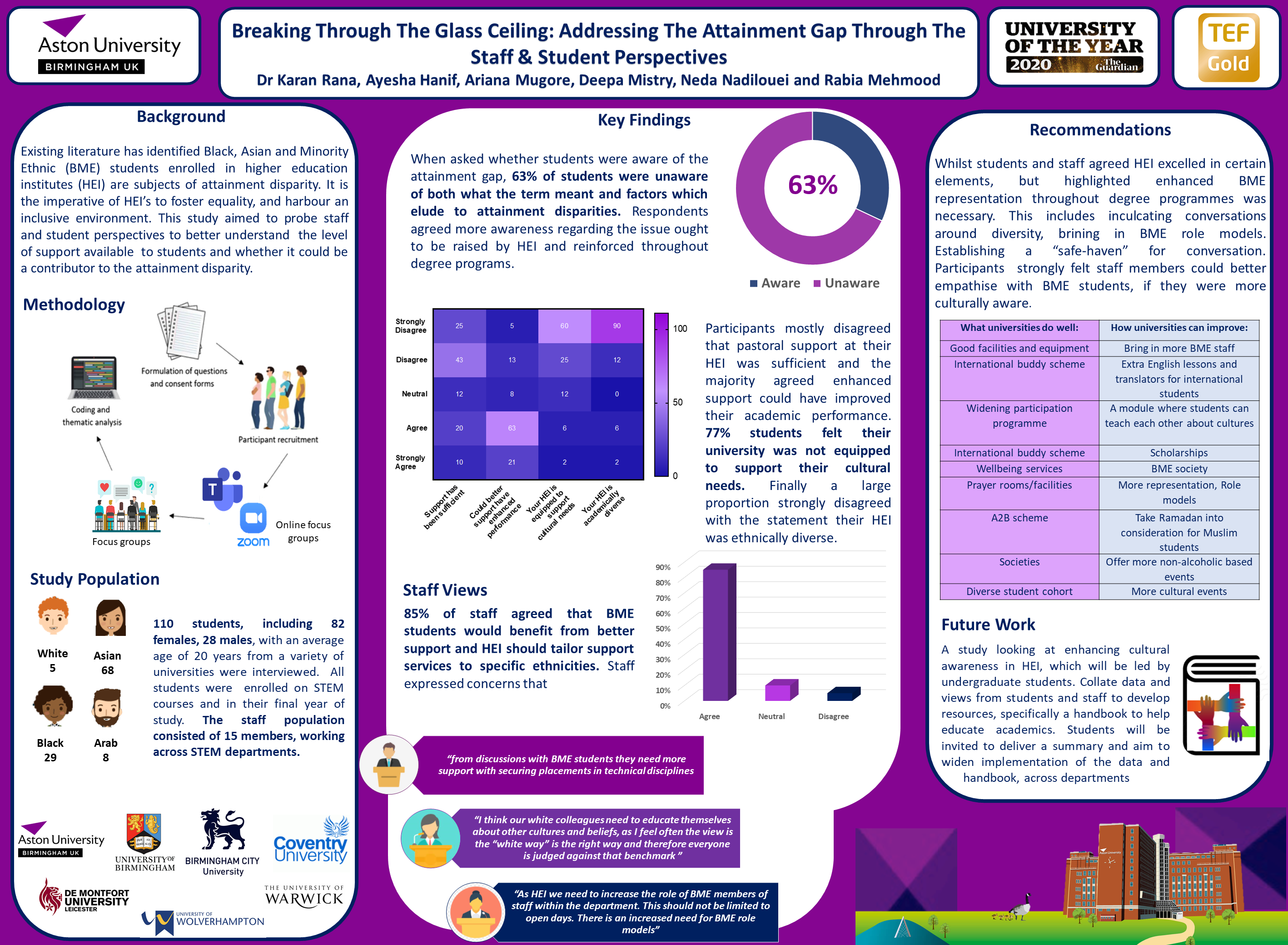 Breaking through the glass ceiling: addressing the attainment gap through student and staff perspectives – Karan Singh Rana, Ayesha Hanif, Ariana Mugore, Deepa Mistry, Neda Nadilouei and Rabia Mehmood (Aston University)