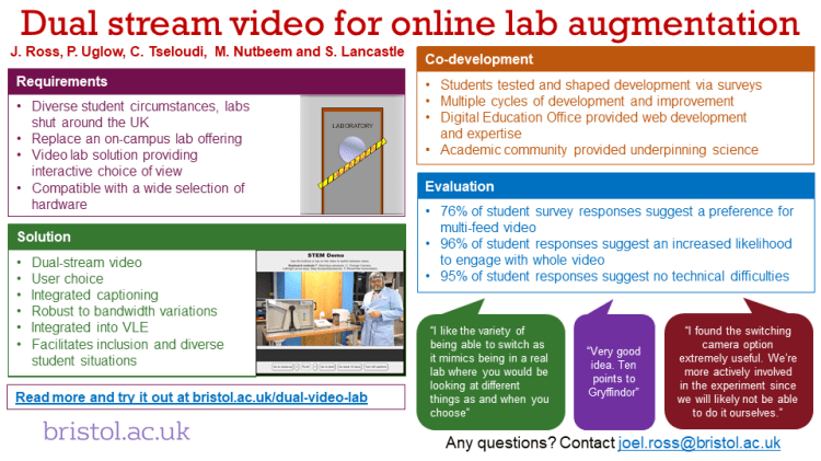 A reflective case study evaluating the affordances of a rapidly co-created dual video channel streaming resource to enhance engineering video augmented labs – Joel Ross, Paddy Uglow, Chrysanthi Tseloudi, Martin Nutbeem and Sean Lancastle (University of Bristol)
